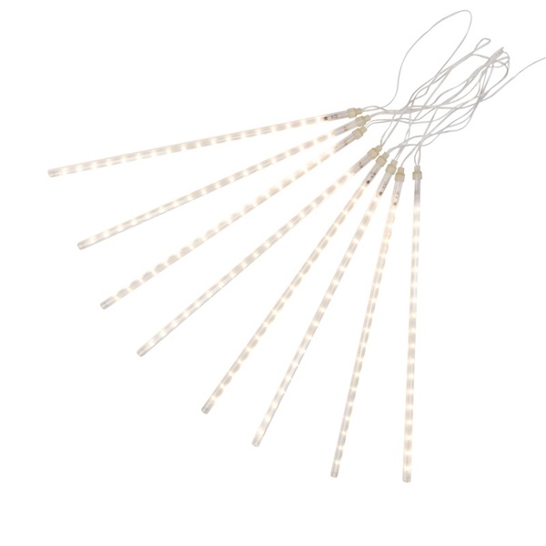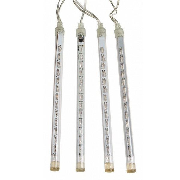 Светодиодная гирлянда «Тающие сосульки» - это оригинальное, красивое и современное средство оформления фасадов и интерьеров зданий, деревьев, витрин и т.д. Она представляет собой комплект из 8 прозрачных пластиковых трубок, расположенных на расстоянии 40 см друг от друга. По всей длине каждой трубки внутри надежно закреплена плата со светодиодами и микрочипом, обеспечивающим динамику с эффектом стекающей капли. Длина каждой трубки 50 см, диаметр 12 мм.