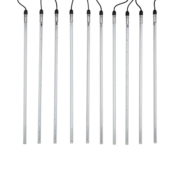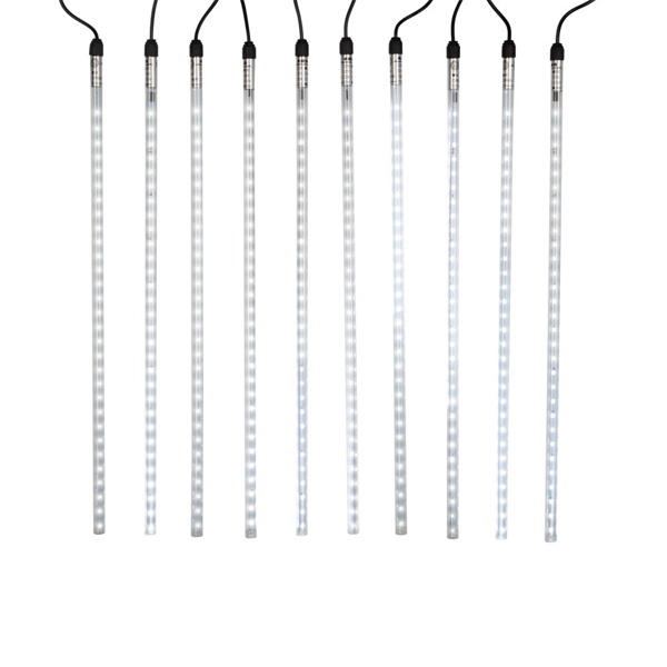 Светодиодная гирлянда «Тающие сосульки» — это оригинальное, красивое и современное средство оформления фасадов и интерьеров зданий, деревьев, витрин и т. д. Она представляет собой комплект из 10 прозрачных пластиковых трубок, расположенных на расстоянии 100 см друг от друга. По всей длине каждой трубки внутри надежно закреплена плата со светодиодами и микрочипом, обеспечивающим динамику с эффектом стекающей капли.