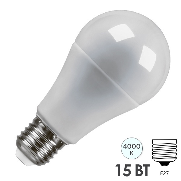Лампа светодиодная FERON LB-94, A60 (шар), 15W 230V E27 4000К (белый), рассеиватель матовый белый, 1350Lm, угол рассеивания 220, 120*60мм
