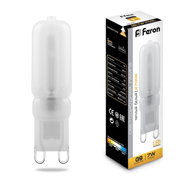 Лампа светодиодная FERON LB-431, JCD9 (капсульная), 7W 230V G9 2700К (белый теплый), рассеиватель матовый белый, 520Lm, угол рассеивания 270, 60*16мм