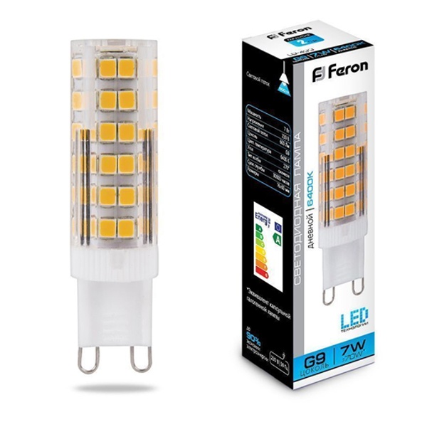 Лампа светодиодная FERON LB-433, JCD9 (капсульная), 7W 230V G9 6400К (дневной), рассеиватель прозрачный 600Lm, угол рассеивания 270, 60*16мм