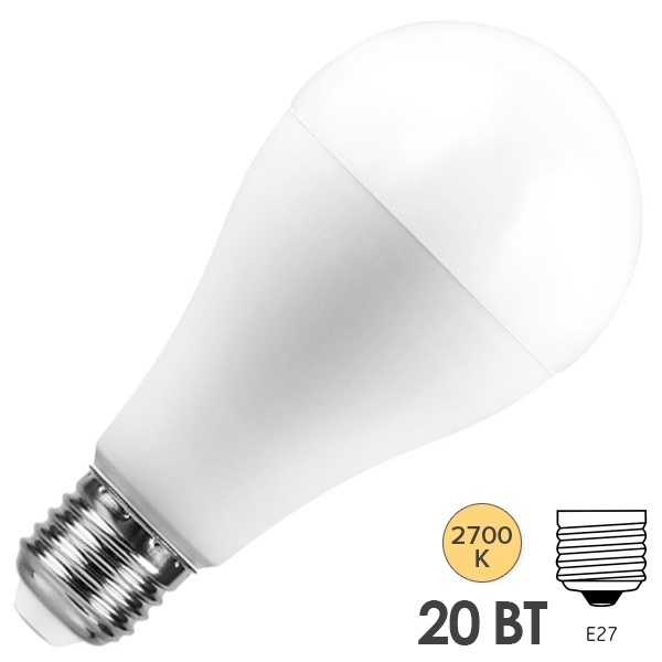 Лампа светодиодная FERON LB-98, A65 (шар), 20W 230V E27 2700К (белый теплый), рассеиватель матовый белый, 1750Lm, угол рассеивания 220, 125*60мм