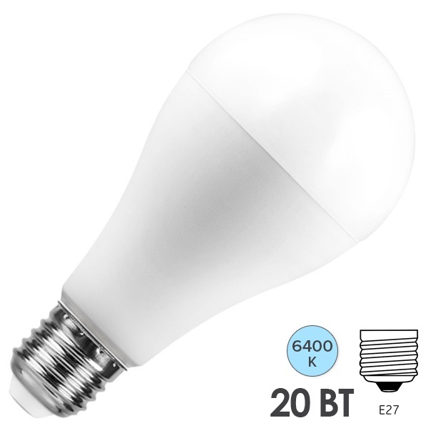 Лампа светодиодная FERON LB-98, A65 (шар), 20W 230V E27 6400К (дневной), рассеиватель матовый белый, 1850Lm, угол рассеивания 220, 135*65мм