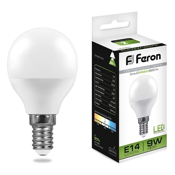 Лампа светодиодная FERON LB-550, G45 (шар малый), 9W 230V E14 4000К (белый), рассеиватель матовый белый, 820Lm, угол рассеивания 220, 80*45мм