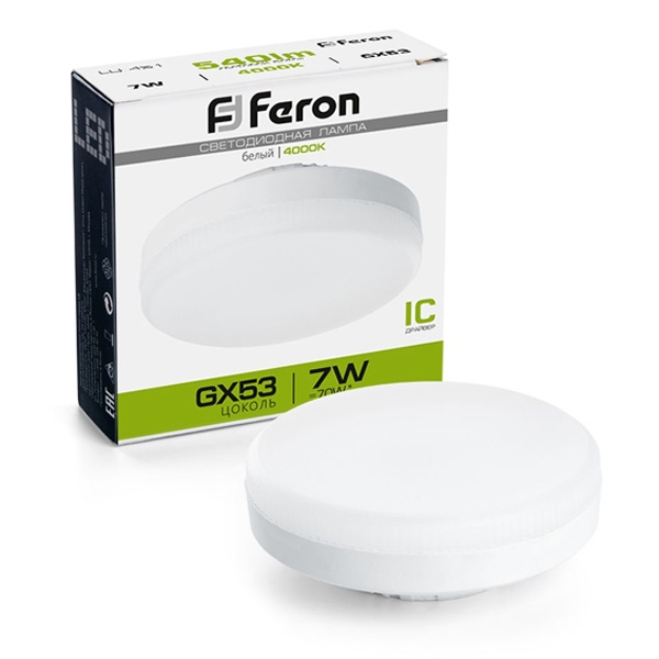 Лампа светодиодная FERON LB-451, GX53 (таблетка), 7W 230V GX53 4000К (белый), рассеиватель матовый белый, 540Lm, угол рассеивания 120, 26*73мм