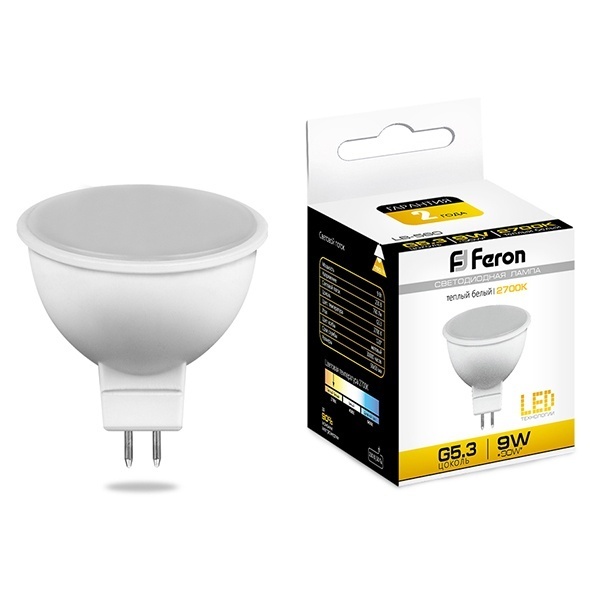 Лампа светодиодная FERON LB-560, MR16 (рефлекторная), 9W 175-265V G5.3 2700К (белый теплый), рассеиватель матовый белый, 760Lm, угол рассеивания 120, 52*50мм