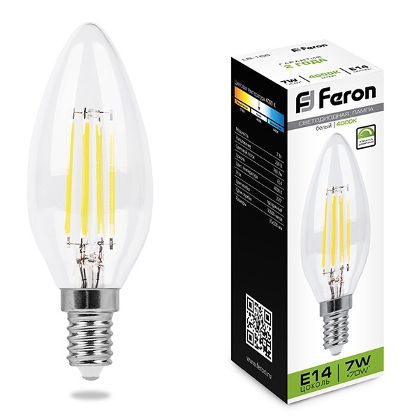 Лампа светодиодная филамент FERON LB-166, C35 (свеча) диммируемая, 7W 230V E14 4000К (белый), рассеиватель прозрачный 760Lm, угол рассеивания 270, 100*35мм