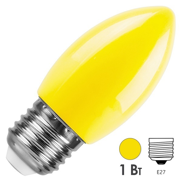 Лампа светодиодная FERON LB-376, C35 (свеча), 1W 230V E27 (желтый), рассеиватель матовый желтый, угол рассеивания 220, 85*35мм