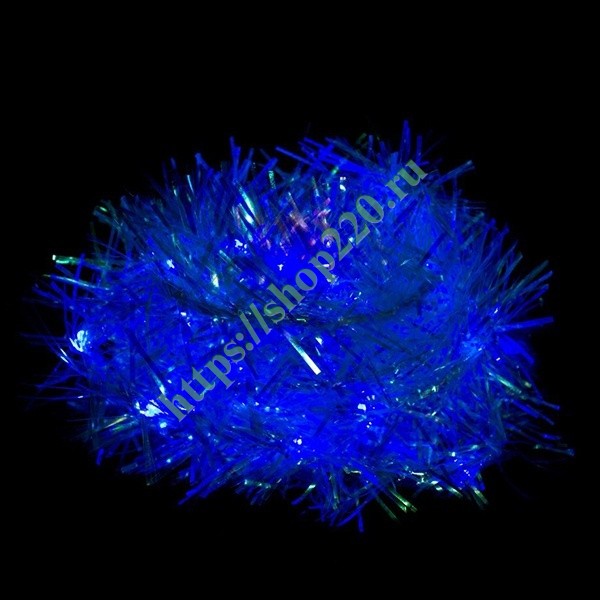 Гирлянда CL40 с полупрозрачной мишурой длиной 6 метров со светодиодами в силиконовой оплетке с синим свечением. Применяется внутри помещений. Светит статично. Работает от бытовой сети.