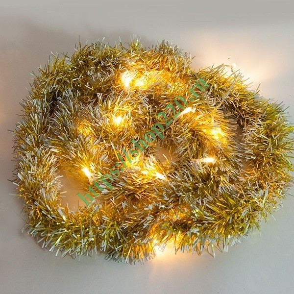 Гирлянда CL800 представляет собой золотистую мишуру длиной 2 метра со светодиодами теплого свечения, светят статично. Применяется внутри помещений. Работает от аккумуляторных батарей, что значительно облегчает выбор места расположения гирлянды.