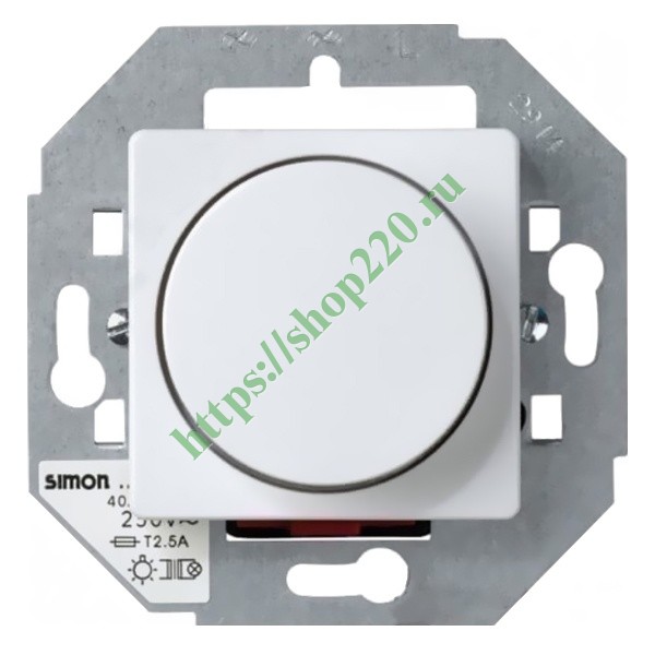 Механизм данного поворотно-нажимного светорегулятора собран в широком пластмассовом модуле. Лицевая панель устройства с поворотно-нажимной кнопкой (ручкой) изготовлена из специального ударопрочного, тугоплавкого пластика, имеет матовое декоративное покрытие белого цвета. Представленное изделие предназначено для управления одним или несколькими осветительными приборами, подключенными к одной цепи. Данный светорегулятор входит в серийную линейку изделий Simon 27, производства известной европейской электротехнической компании Симон.