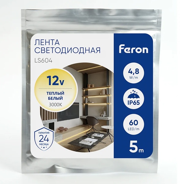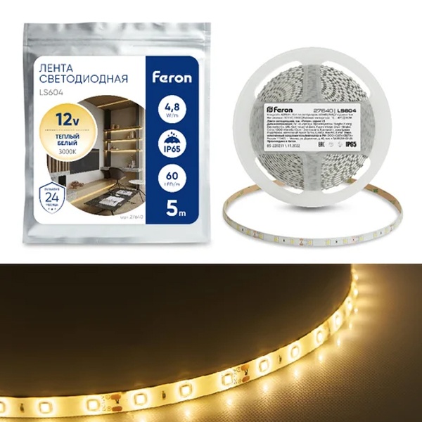 Герметичная светодиодная лента белая (теплый свет) 5m LS604 60SMD(3528)/m 12V, мощностью 4.8W/m, со степенью защиты IP65 Ферон 27640