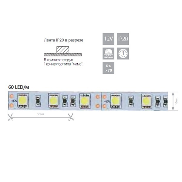 Лента светодиодная 12V FERON LS606, 60*SMD5050, 14,4W/m, IP20, 3000К (теплый белый), Кратность резки мм 50мм, 5000 *10 *2.32мм