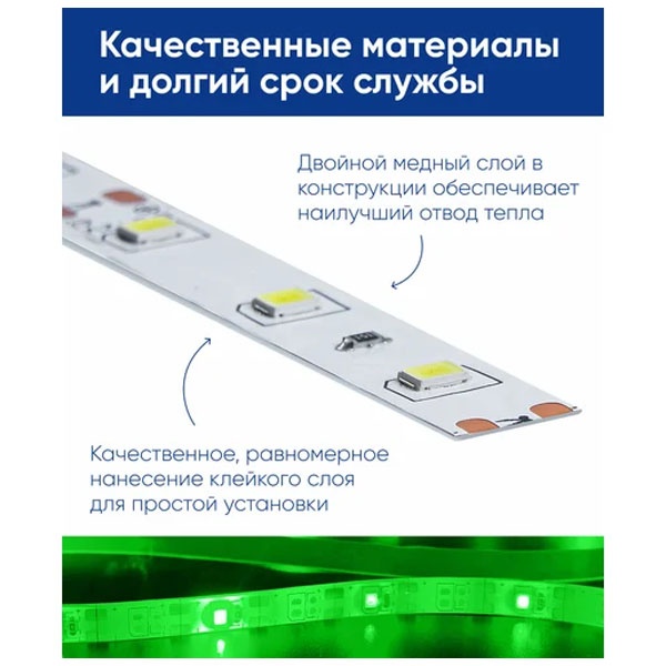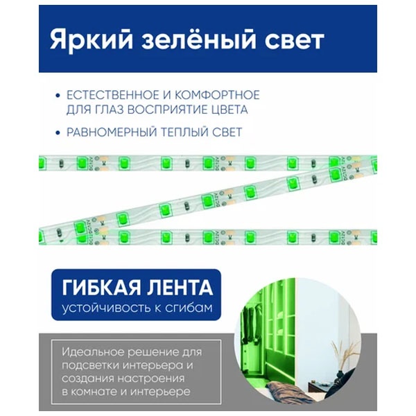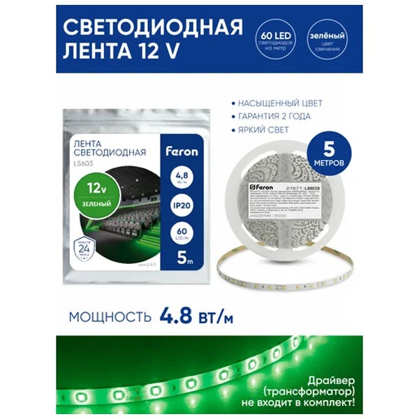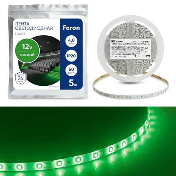 Лента светодиодная 12V FERON LS603, 60*SMD2835, 4,8W/m, IP20, (зеленый), Кратность резки мм 50мм, 5000 *8 *1,22мм