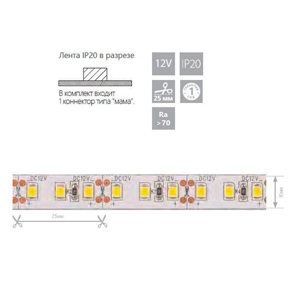 Лента светодиодная 12V FERON LS612, 120*SMD2835, 9,6W/m, IP20, 6500К (холодный белый), Кратность резки мм 25 мм, 5000 *8*1,22мм
