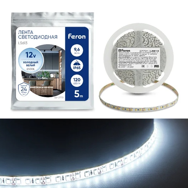 27731 Светодиодная лента Feron LS613 120SMD(3528) 9.6/m 12V IP65 5000х10х3.8mm белый фото 6
