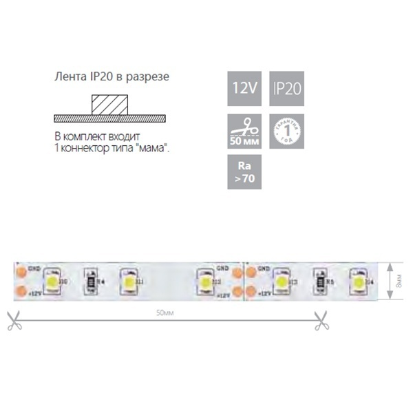Напряжение - 12VМощность - 4.8WЦвет свечения - холодный белыйЦветовая температура - 6500ККоличество LED - 60/mСтепень защиты - IP22Цвет основания - на белом основанииДлина изделия - 1000ммШирина изделия - 8мм