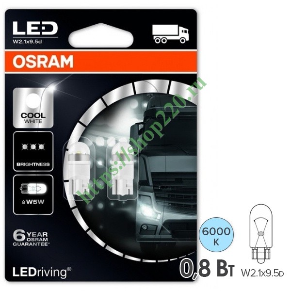 Данный комплект светодиодных источников освещения от известной компании Osram серии LEDriving Premium представляет собой сигнальные огни повышенной яркости в количестве 2 единиц, упакованные в блистер. Они подходят для замены стандартных источников света типа W5W с цоколем W2.1x9.5d. Оптимальная величина напряжения для данного набора ламп составляет 24 Вольта, что допускает их применение в грузовом и коммерческом транспорте. Установка изделий производится в качестве сигнальных огней в фары заднего хода или освещения салона. Лампы мощностью 0.84 Ватта отличаются экономичностью благодаря сниженному энергопотреблению на 80% по сравнению со стандартными источниками света. Среди их преимуществ выделяют устойчивость к вибрациям и ударам и легкую установку по принципу plug and play. Холодный белый свет с цветовой температурой 6000 Кельвинов, который создается благодаря последнему поколению светодиодов, придает не только стильное оформление автомобилю, но и обеспечивает безопасное вождение с однородным излучением по всем направлениям, которое хорошо заметно в непогоду или туман. Световой поток достигает 85 Люменов. Увеличенный срок службы подтверждается 6-летней гарантией производителя и составляет примерно 5000 часов эксплуатации.