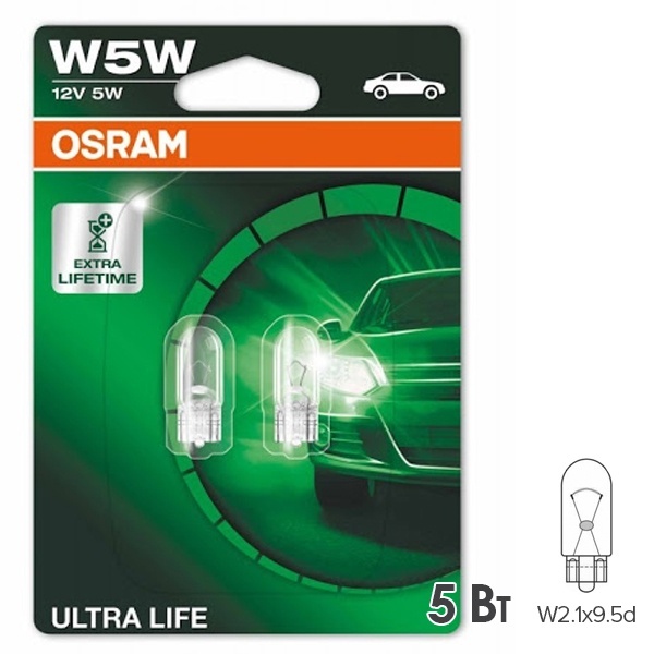 Для того чтобы производить замену автомобильных ламп реже, чем обычно, известная компания Osram предлагает линейку долговечных источников света Ultra Life. Данный комплект упакован в фирменный блистер и включает в себя 2 лампы, предназначенные для установки в легковые автомобили и мотоциклы с бортовым напряжением 12 Вольт. Они применяются в задних фарах, стоп-сигналах, габаритных и стояночных огнях, для подсветки номерного знака, а также внутрисалонного освещения и багажного отделения. Изделия относятся к категории W5W и фактически считаются бесцокольными. Они вставляются в патрон W2.1x9.5d и внешне представляют собой две проволоки, выведенные с нижней сплюснутой части колбы, которые загнуты по разным сторонам. Мощность каждой модели составляет 5 Ватт и обеспечивает экономичное энергопотребление, которое влияет на длительность рабочего ресурса. Срок службы изделий достигает 1500 часов. Излучаемый световой поток достигает 50 люменов. Автолампы обеспечивают безопасность и уверенность на дороге, так как являются надежными и проверенными. Это отличный вариант для тех, кто много времени проводит за рулем и выбирает долговечные лампы с целью редких замен. Каждое изделие имеет следующие параметры: