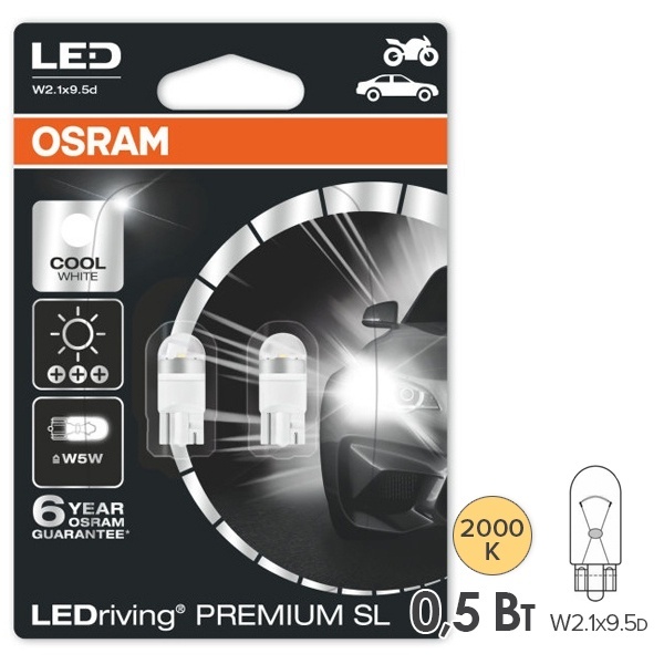 Современные автолампы от известной компании Osram из линейки LEDriving SL представляют собой светодиодные сигнальные огни, которые обладают ярким оранжевым светом и предназначены для указателей поворотов. С ними вождение считается более безопасным, так как данная серия источников света характеризуется хорошо заметным излучением и улучшенным распределением света. Комплект состоит из 2 единиц и упакован в блистер. Он пригоден для замены источников света типа W5W и цоколем W2.1x9.5d. Такие лампы рассчитаны на установку в легковые автомобили с бортовым напряжением 12 Вольт, а также в мотоциклы. Световой поток, излучаемый изделиями, составляет 7 Люменов. Их достоинствами считают высокую эффективность (сниженном на 80% энергопотреблении, если сравнивать со стандартными источниками света), также это устойчивость к вибрациям и ударам, элегантный внешний вид и компактные размеры. Продолжительный срок службы до 4000 часов подтверждается 4-летней заводской гарантией. Легкая замена, быстрая установка и подключение по принципу plug and play делает источники света удобными в применении.