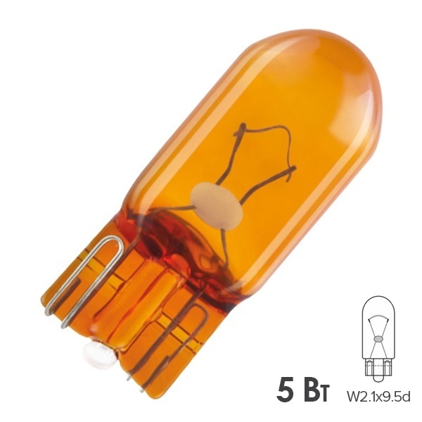 Сигнальные автомобильные лампы накаливания от известной компании Osram из серии Original представляют собой источники освещения в картонной коробке по 10 штук, которые применяются в передних и задних указателях поворота. Они рассчитаны на бортовое напряжение 12 Вольт и устанавливаются в легковые автомобили и мотоциклы. Такой тип источников света имеет колбу с янтарным покрытием и излучает оранжевый свет с мощностью светового потока 30 Люменов. При совершении маневра свет от данных ламп будет заметен для других участников движения даже в непогоду или туман, поэтому они повышают безопасность и уверенность в поездках. Модели относятся к категории WY5W с установкой в патрон W2.1x9.5d. Фактически они считаются бесцокольными, так как их контакты, к которым подключается питание, представляют собой две проволоки, выведенные с нижней сплюснутой части колбы и загнуты по разным сторонам. Мощность каждой лампы составляет 5 Ватт, а срок их службы достигает 1000 часов. Они обладают высоким качеством изготовления и компактными размерами со следующими характеристиками: