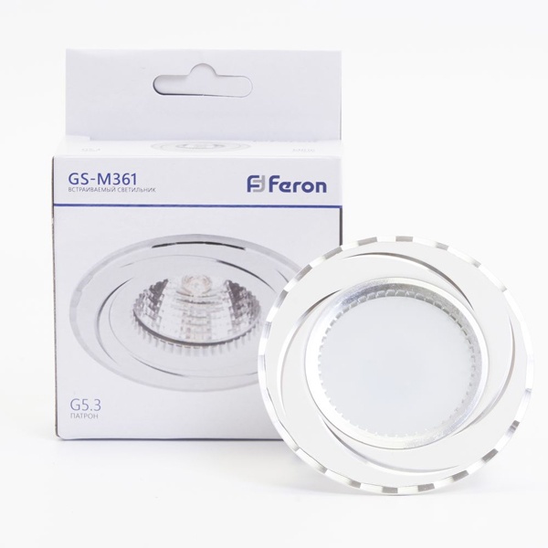 Светильник потолочный встраиваемый (ИВО) FERON GS-M361W, под лампу MR16 G5.3, белый-хром, круг, 80*80*25 мм, монтажный диаметр 57мм, корпус металл, неповоротный