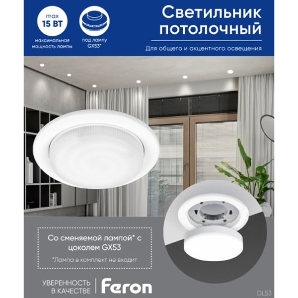 Светильник потолочный встраиваемый (ФВО) FERON DL53, под лампу GX53 GX53, белый, круг, 106*106*20 мм, монтажный диаметр 81мм, корпус металл, неповоротный