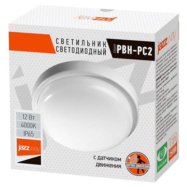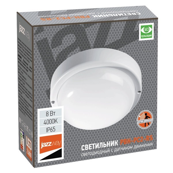 Влагозащищенный, светодиодный светильник с микроволновым датчиком движения JazzWay PBH-PC2-RS, 8Вт, нейтральный белый свет 2852113