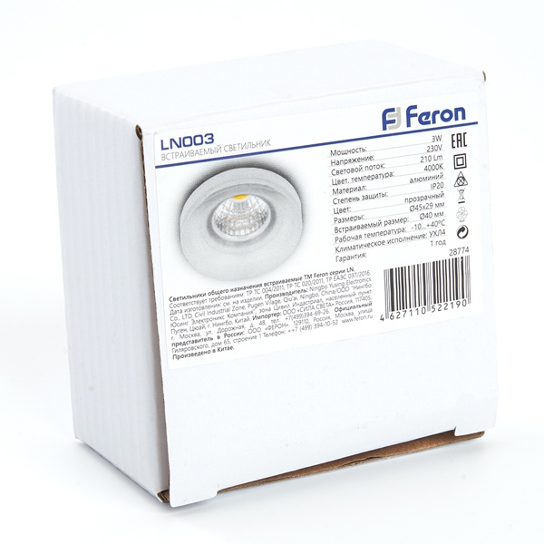 Светильник встраиваемый светодиодный, для подсветки мебели (ДВБ) FERON LN003, 3W 4000К (белый), 230V, 210Lm, IP20, цвет прозрачный, корпус алюминий, рассеиватель акриловый полимер, 45*45*29 мм, монтажн.отв. 40 мм.
