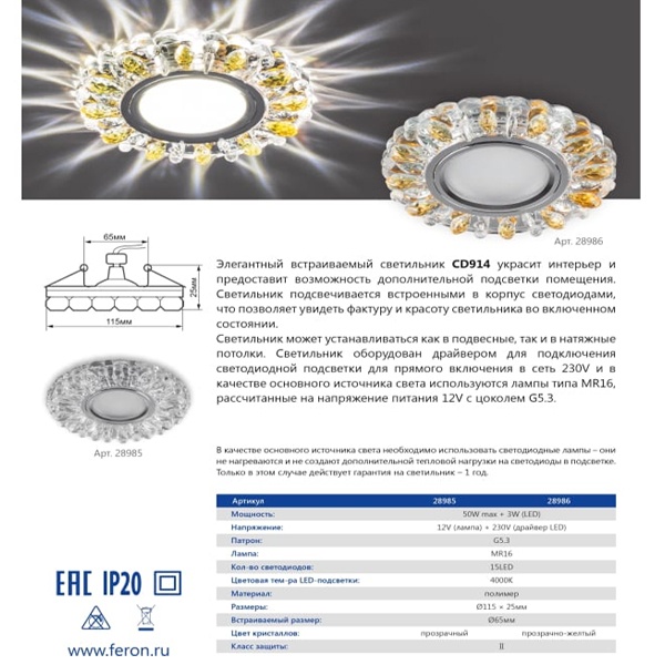 Встраиваемый, декоративный, круглый светильник Ферон CD914 прозрачный хром с подсветкой из 15 светодиодов белого свечения, 230 Вольт, под лампу MR16 мощностью до 50 Ватт с цоколем G5.3 28985