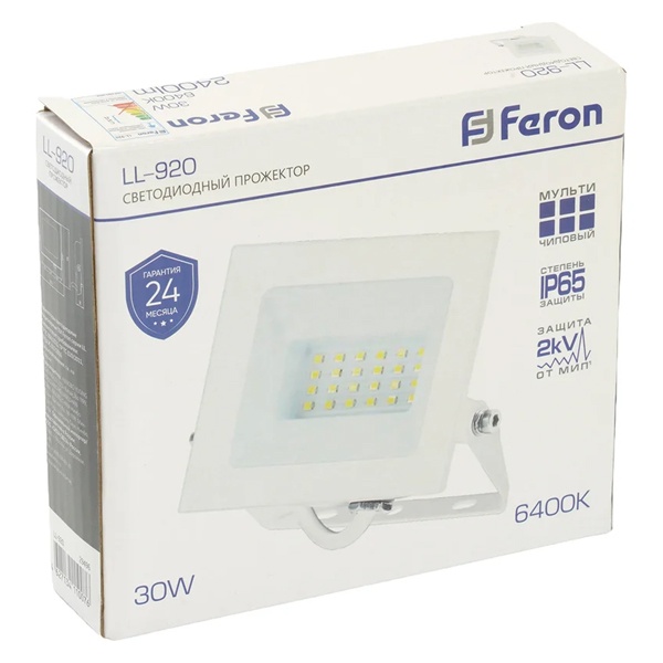 Прожектор светодиодный многоматричный с монтажным креплением на кронштейн, (ДО) FERON LL-920 , 30W, 6400К (холодный белый), 230V/50Гц, 3000Lm, IP65, угол рассеивания 120,*SMD2835, раб.t -40C - +40C, цвет белый, корпус алюминий литой под давлением + стекло, 126,5*114*28 мм
