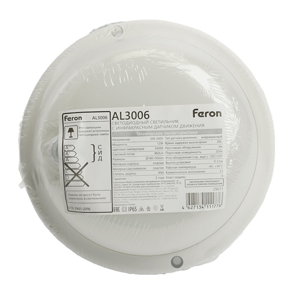 Пылевлагозащищённый светодиодный светильник AL3006 ТМ Feron артикул 29611 имеет встроенный инфракрасный датчик движения и предназначен для использования в помещениях с нерегулярной потребностью в освещении. Идеально подходит для сферы ЖКХ и коммунальных хозяйств.