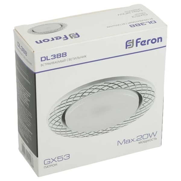 Светильник потолочный встраиваемый (ФВО) FERON DL388, под лампу GX53 GX53, белый, круг, 108*108*28 мм, монтажный диаметр 81мм, корпус металл, неповоротный