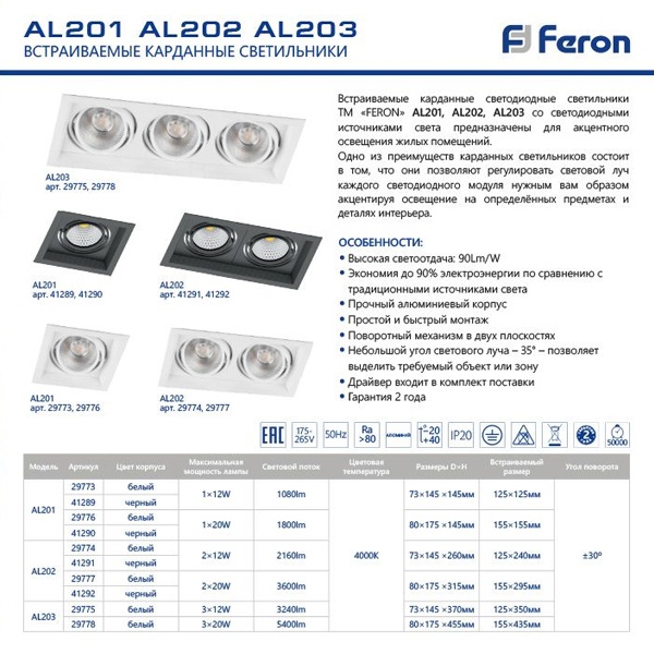 Встраиваемый карданный светильник для бытового применения Ферон AL201, 1x20Вт, нейтральный белый свет 29776