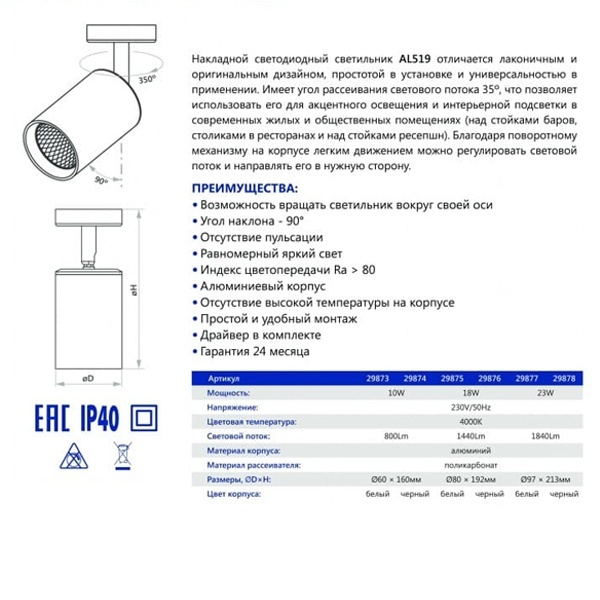 Накладной светодиодный светильник AL519 отличается лаконичным и оригинальным дизайном, простотой в установке и универсальностью в применении. Имеет угол рассеивания светового потока 35°, что позволяет использовать его для акцентного освещения и интерьерной подсветки в современных жилых и общественных помещениях (над стойками баров, столиками в ресторанах и над стойками ресепшн). Благодаря поворотному механизму на корпусе легким движением можно регулировать световой поток и направлять его в нужную сторону.