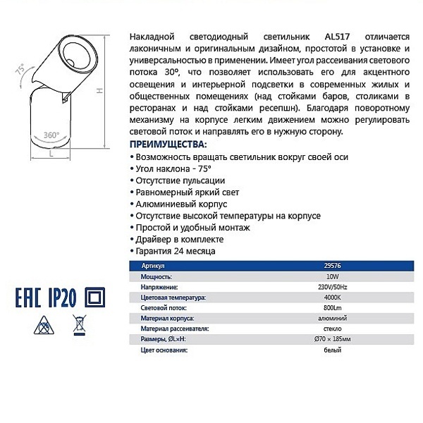 Накладной светодиодный светильник AL517 отличается лаконичным и оригинальным дизайном, простотой в установке и универсальностью в применении. Имеет угол рассеивания светового потока 30°, что позволяет использовать его для акцентного освещения и интерьерной подсветки в современных жилых и общественных помещениях (над стойками баров, столиками в ресторанах и над стойками ресепшн). Благодаря поворотному механизму на корпусе легким движением можно регулировать световой поток и направлять его нужную сторону.
