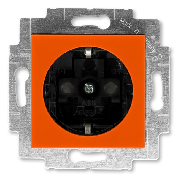 Электрическая розетка с заземляющим контактом и шторками АББ серии Левит, для установки в монтажную коробку, цвет оранжевый/дымчатый черный. 2CHH203457A6066