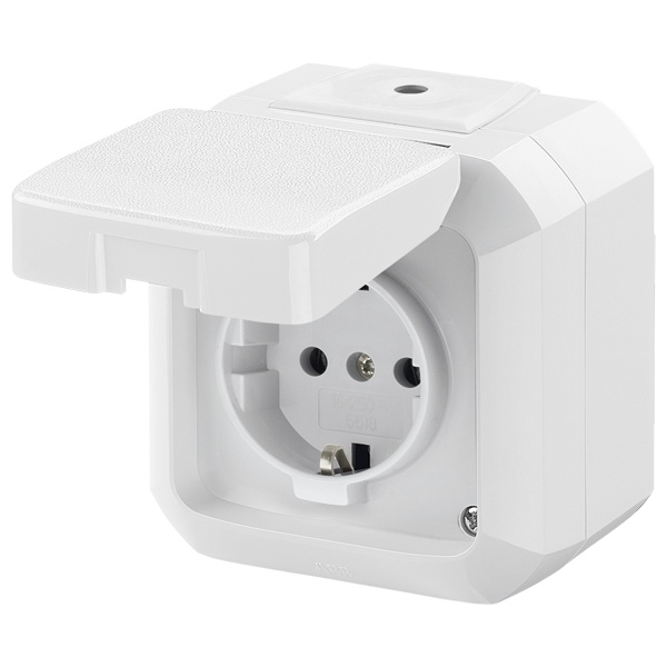 Влагозащищенная розетка с заземлением и защитной крышкой накладного исполнения, белого цвета, АББ Вариант+. 2CHN183510C4500