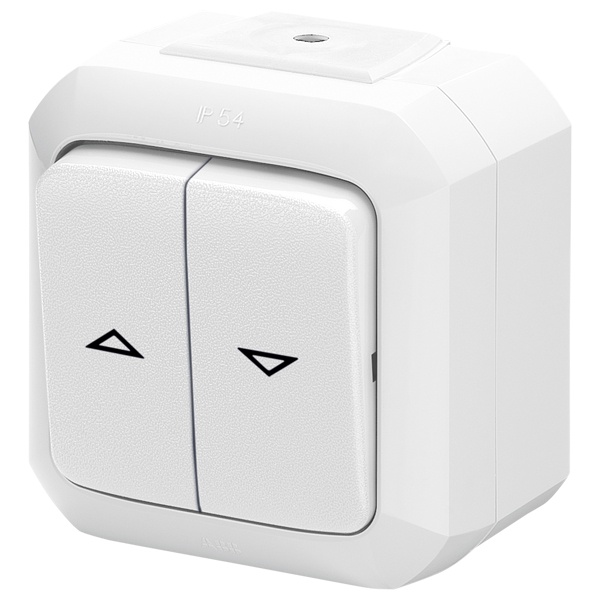 Влагозащищенный двухклавишный выключатель для управления жалюзи белого цвета накладного исполнения с винтовым подключением и пентограммами, АББ Вариант+. 2CHN588951C4500