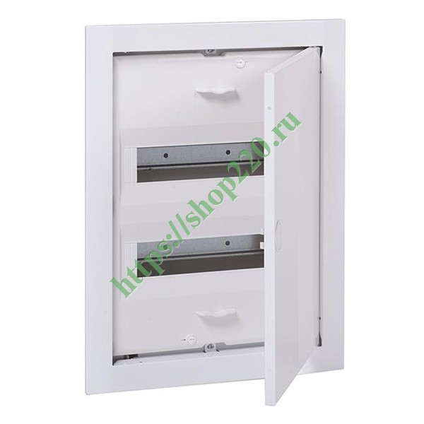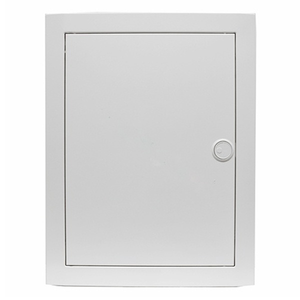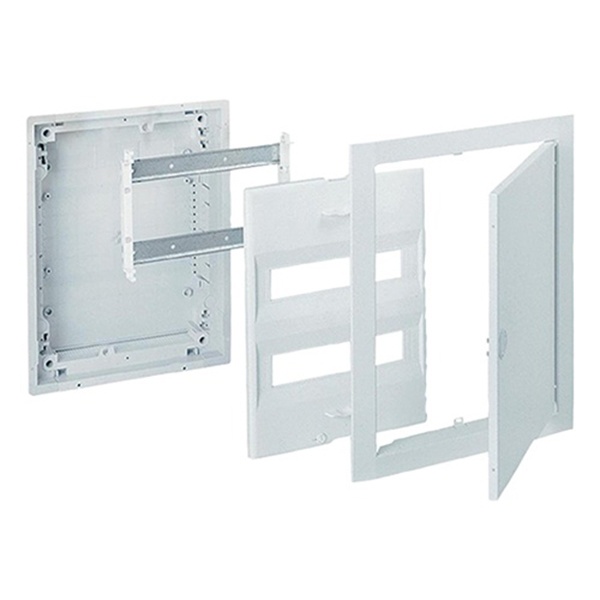 Электрический распределительный шкаф ABB UK524N3 на 24 (28) модуля предназначен для скрытого монтажа. Распределительный шкаф состоит из корпуса, защитной панели, рамы с металлической дверцей и рамки с DIN -рейками. Материал корпуса — самозатухающий термопластик серого цвета, защитной панели — самозатухающий термопластик белого цвета, с окнами для модулей. Защитная панель крепится к корпусу при помощи двух пластмассовых винтов. Дверца и рамка металлические, белого цвета, крепятся к корпусу при помощи саморезов, при желании можно установить дверку другого цвета или дизайна из серии BL. Дверца открывается вбок и может быть установлена как на правую, так и на левую стороны. На верхней и нижней стенках корпуса намечены прямоугольные отверстия для ввода кабеля.