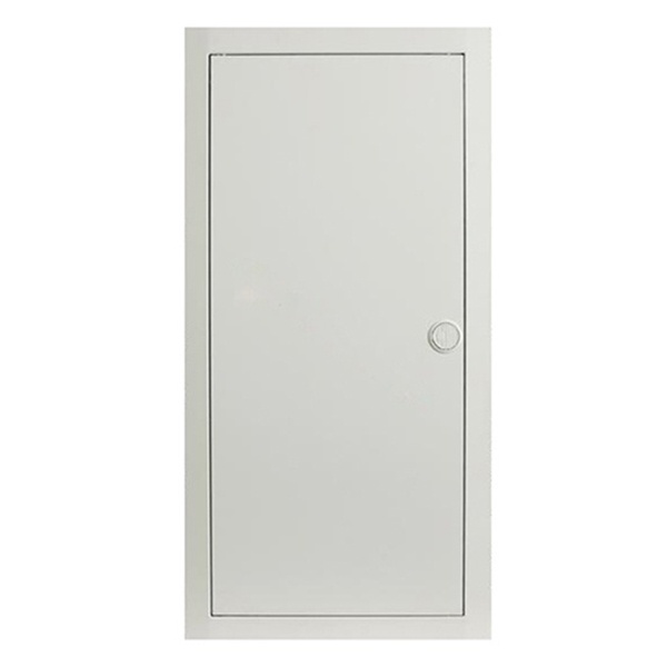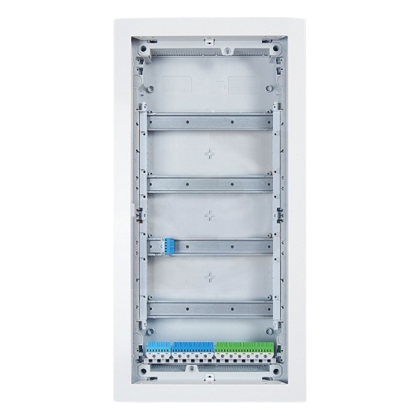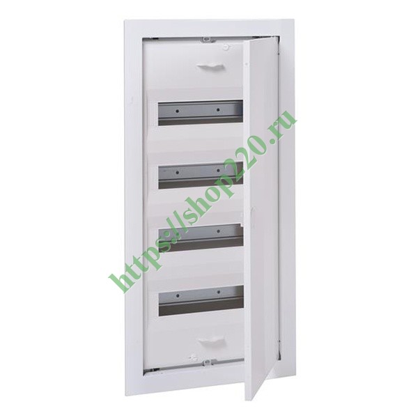 Электрический распределительный шкаф ABB UK548N3 на 48 (56) модуля предназначен для скрытого монтажа. Распределительный шкаф состоит из корпуса, защитной панели, рамы с металлической дверцей и рамки с DIN -рейками. Материал корпуса — самозатухающий термопластик серого цвета, защитной панели — самозатухающий термопластик белого цвета, с окнами для модулей. Защитная панель крепится к корпусу при помощи двух пластмассовых винтов. Дверца и рамка металлические, белого цвета, крепятся к корпусу при помощи саморезов, при желании можно установить дверку другого цвета или дизайна из серии BL. Дверца открывается вбок и может быть установлена как на правую, так и на левую стороны. На верхней и нижней стенках корпуса намечены прямоугольные отверстия для ввода кабеля.