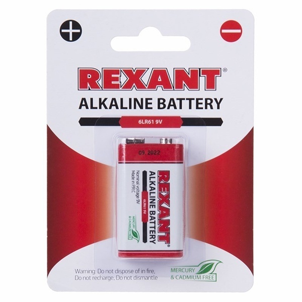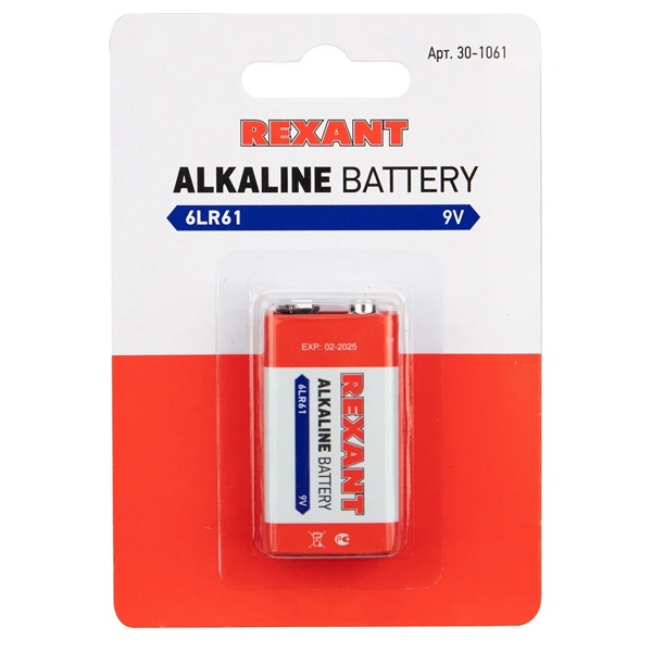 Алкалиновая (щелочная) батарейка Крона Рексант, ёмкостью 600 мАч (6LR61/6LP3146/MN1604) 30-1061