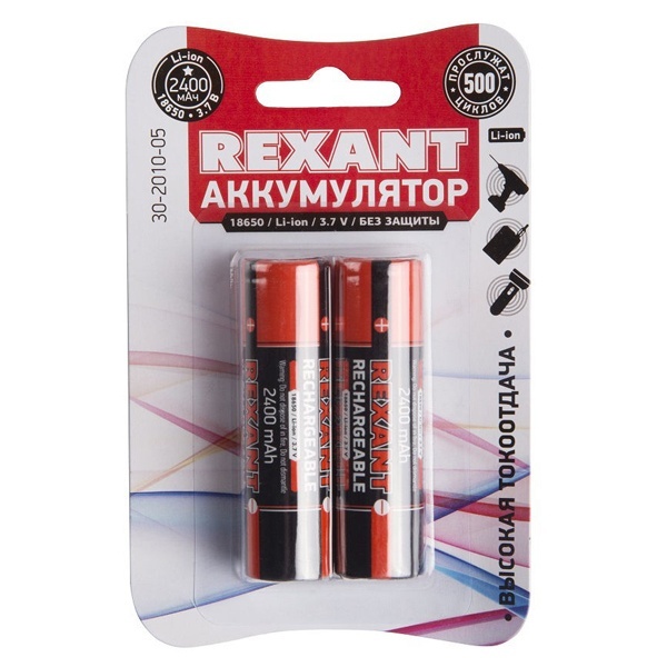 Литий-ионный аккумулятор Рексант 18650 ёмкостью до 2400 мАч (2 шт) 30-2010-05