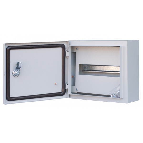 Корпус распределительный комплектуются DIN-рейками, фальш-панелью, металлической планкой для установки шин N и PE, замком-защелкой, набором для крепления проводника заземления. Набор знаков электробезопасности: два знака "Заземлено" и знак "Высокое напряжение"