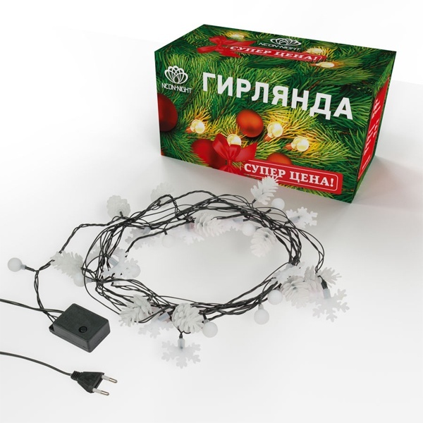 303-064 Гирлянда светодиодная универсальная с насадками (шарики, снежинки, елочки) 30 LED мультиколор, 4,4 м