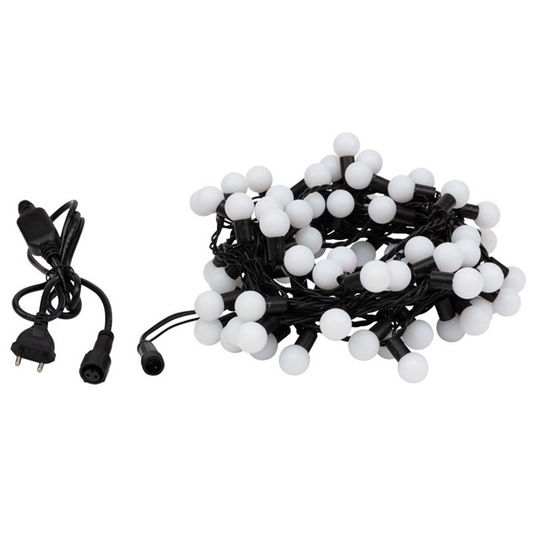 Данная гирлянда имеет длину 10м. на которой равномерно расположены 80 шариков диаметром 23мм с цветом свечения RGB.