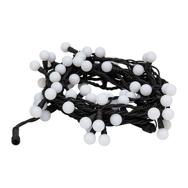 Данная гирлянда имеет длину 10 м, на которой равномерно расположены 80 шариков диаметром 23 мм с Белым цветом свечения.