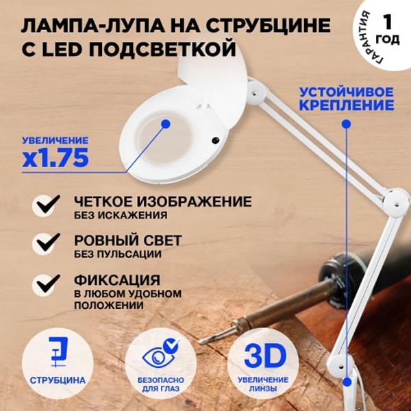 Лупа на струбцине квадратная настольная 3Х с подсветкой, белая REXANT предназначена для визуального увеличения различных мелких предметов или их фрагментов.Она используется в косметологии, в тату-салонах, при выполнении ювелирных и радиомонтажных работ, при ремонте часов, в биологии и медицине, в швейном и вышивальном деле, для организации труда людей со слабым зрением, а также для других работ, где требуется дополнительное увеличение и подсветка рабочего поля.Такая оптическая система состоит из линзы, удобного пантографического механизма и бестеневой подсветки.