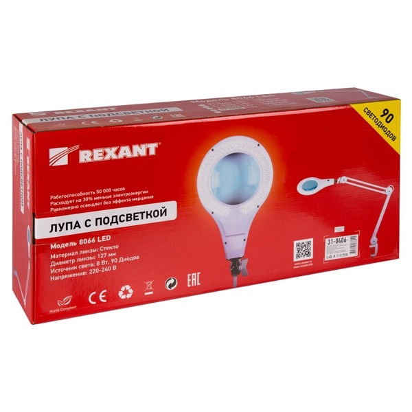 Лупа на струбцине круглая настольная 8Х с подсветкой с крышкой, белая REXANT предназначена для визуального увеличения различных мелких предметов или их фрагментов.Она используется в косметологии, в тату-салонах, при выполнении ювелирных и радиомонтажных работ, при ремонте часов, в биологии и медицине, в швейном и вышивальном деле, для организации труда людей со слабым зрением, а также для других работ, где требуется дополнительное увеличение и подсветка рабочего поля.Такая оптическая система состоит из линзы, удобного пантографического механизма и бестеневой подсветки.