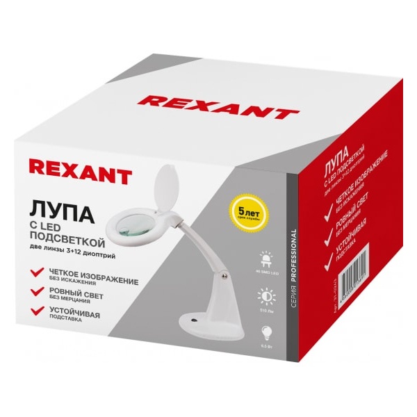 Лупа настольная 3D+12D REXANT с подсветкой 40 SMD LED, белая